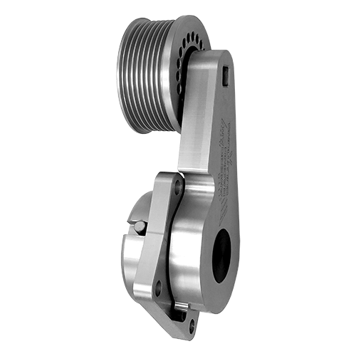 This one is for the serious racers with big blowers making more than 1000 HP. If this is you, then you have already moved past your factory belt tensioner to an aftermarket brand but nothing on the market can stand up this monster. Our racing tensioner has a 60 LB spring and is fabricated from 6061-T6 Billet Aluminum, not cast. Internal components include a TGP shaft, hardened bushings, heavy duty proprietary spring and thrust bearings make this the strongest and smoothest belt tensioner on the market. It has been tested and proven on the Dyno and The Track at over 1,500 RWHP and will reduce if not eliminate belt slip, which will increase boost and HP. To support all that power and boost we have increased the length of the boss to accommodate a double bearing pulley. Best of all it is a direct bolt on replacement for the stock unit, no brackets, fittings our adapters are needed. We offer a variety of sizes of double bearing pulleys in either grooved or smooth finishes. We are so confident that our tensioner will not bend or break that we will guarantee it for the life.